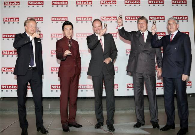 ▲(從左到右)德國駐華公使Frank Rückert博士、著名影視演員李晨、Miele第四代繼承人Reinhard Zinkann博士和Markus Miele博士以及德國美諾Miele亞洲區(qū)董事總經(jīng)理Mario Miranda先生一齊舉杯慶祝德國美諾Miele北京旗艦店開幕。