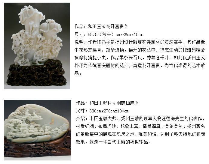 2014年4月1日,由中國藝交所舉辦的“傳承·新疆和田玉雕精品專場”在中國藝術(shù)品大廈開幕。此次展覽從4月1日起至4月20日止為期二十天。整場玉石展覽將展出總價值超過2億元的和田玉精品,其中大部分為當(dāng)代玉雕大師雕琢而成。
