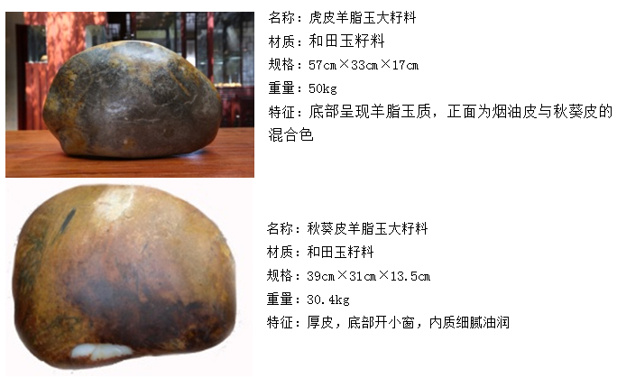 本次展覽所展出的珍稀和田羊脂玉原料,包括重達(dá)百斤的元寶形、虎皮色“虎皮羊脂玉大籽料”,料型完美,底部能清楚看到內(nèi)部細(xì)潤的羊脂玉質(zhì),堪為稀世珍寶。另有“灑金皮金蟾籽料”,外觀為金蟾型,灑金皮色,天然的吉祥料型,世所罕見。