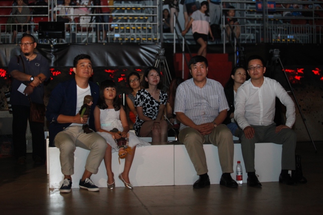 黃磊和多多與雨潤控股集團(tuán)董事馮寬德先生(右二)一同觀看發(fā)布會表演
