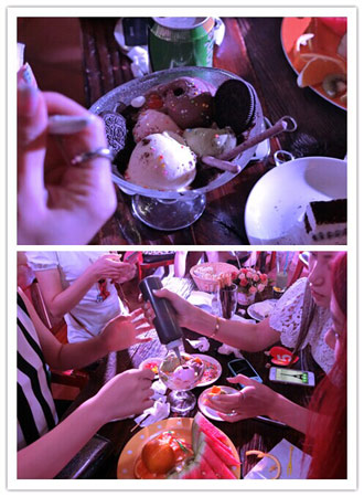 進(jìn)入花式冰淇淋DIY環(huán)節(jié),在專業(yè)老師的指導(dǎo)下,粉絲們自行選取材料制作創(chuàng)意冰淇淋作品。“這是我的花式冰淇淋作品,里面加入了巧克力棒、曲奇餅干、各種形狀的水果糖,別看品種挺多,可是亂中有序喔。”一位女粉絲興奮地向大家展示她的作品,在得到老師的稱贊后,便迫不及待的拿起TR350S與之合影,借助TR350S將她的嬌俏模樣一一記錄下來。