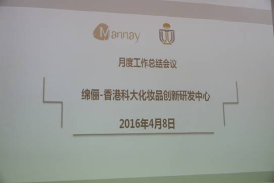 2016年4月8日,香港科技大學講座教授、綿儷香港科大化妝品創(chuàng)新研發(fā)中心詹華強主任研究團隊走進了綿儷深圳龍崗工廠,就綿儷香港科大化妝品創(chuàng)新研發(fā)中心當前的工作進度進行了總結(jié)和交流,并向綿儷公司傳遞了當前工作成果。會議還按照以往慣例,對綿儷香港科大化妝品創(chuàng)新研發(fā)中心當前的工作進度,面臨的問題和解決的方案進行了討論。