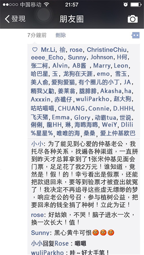 而通過此事,陳小姐也似乎一下子清醒了,在朋友圈中寫道“決定不再追尋這些虛無縹緲的夢”,而是響應(yīng)“仲基老公”的號召,將失而復(fù)得的2萬元捐到公益植樹,以此表達對偶像的支持。“不管最后能否搶到見面會門票,這次的教訓(xùn)也會是我難得的人生警言,表達愛的方式不會只有一條路,讓小愛變成大愛才是真正的意義。”子琪對筆者說。