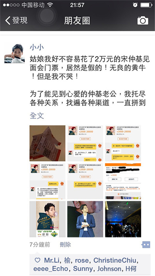 然而,官方發(fā)票日期一再推遲,黃牛票一路飚升;好不容易等到開票,瞬間又被秒光。子琪不得不接受男神漸行漸遠的現(xiàn)實。正當(dāng)她找遍各種關(guān)系,接近絕望的時候,和一位黃牛取得了聯(lián)系,對方聲稱自己有宋仲基粉絲見面會的門票出售,并承諾可以上臺與宋仲基合影抱抱,子琪激動不已,咬牙最終以20000元的高價成交。不料,好不容易到手的居然是假票,陳小姐憤怒之下把票撕了個粉碎。雖然最后還是追回了騙款,她的心情也跌落到了冰點。