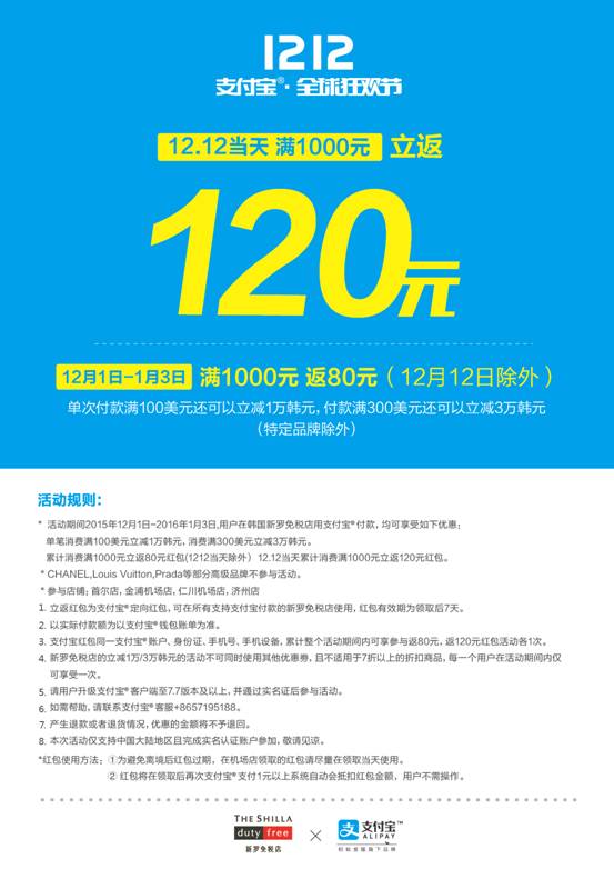 雙十二全球購物狂歡節(jié)來襲,新羅免稅店攜手支付寶為中國游客提供加倍的優(yōu)惠折扣。在韓國新羅免稅店使用支付寶進(jìn)行支付,均可享受多重優(yōu)惠活動。12.12當(dāng)天消費滿1000元立返120元,2015年12月1日-2016年1月3日期間消費滿額立減,多輪促銷狂歡將持續(xù)長達(dá)一個月。
